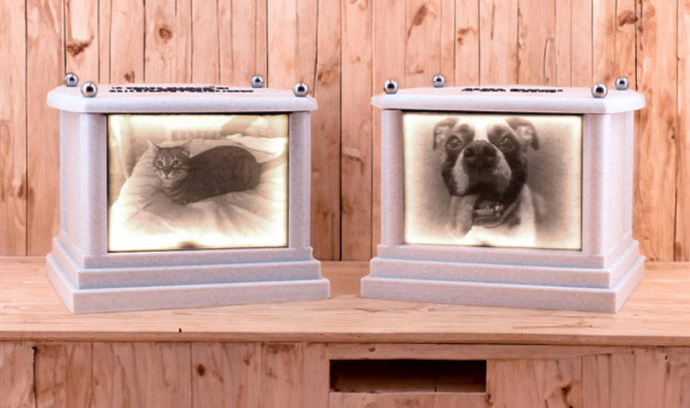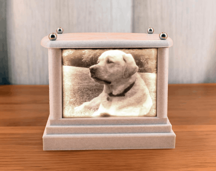 A Halo Urn is a custom-made pet urn that features a softly backlit photo of your beloved pet—designed to honor their memory with warmth, light, and grace.